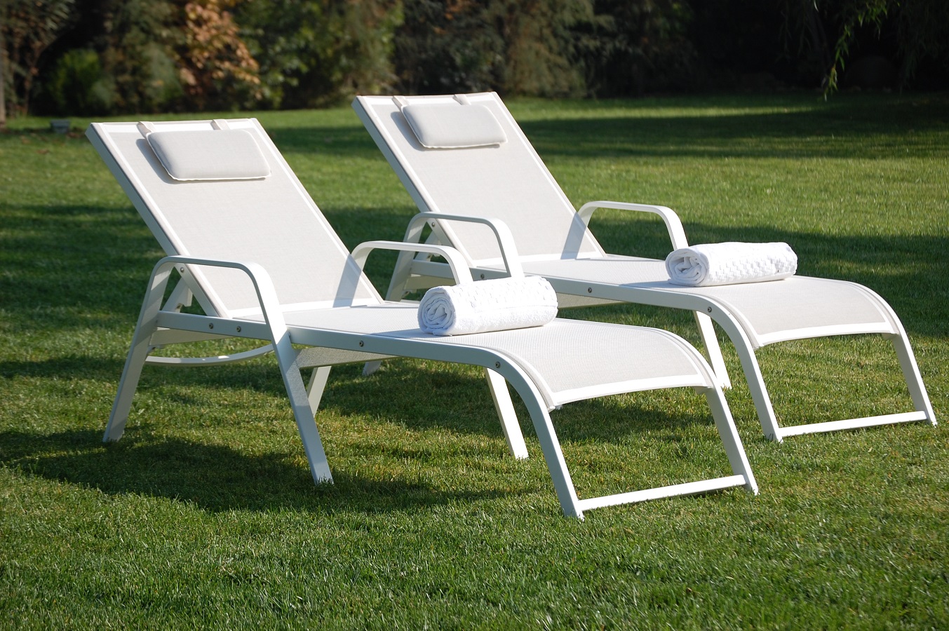 Liegen mit Gestell aus Aluminium in weiß, bronze, sand oder rotbraun. Stapelbar, Rücken verstellbar. Die Bespannung ist aus PVC-Gewebe in diversen Farben möglich.