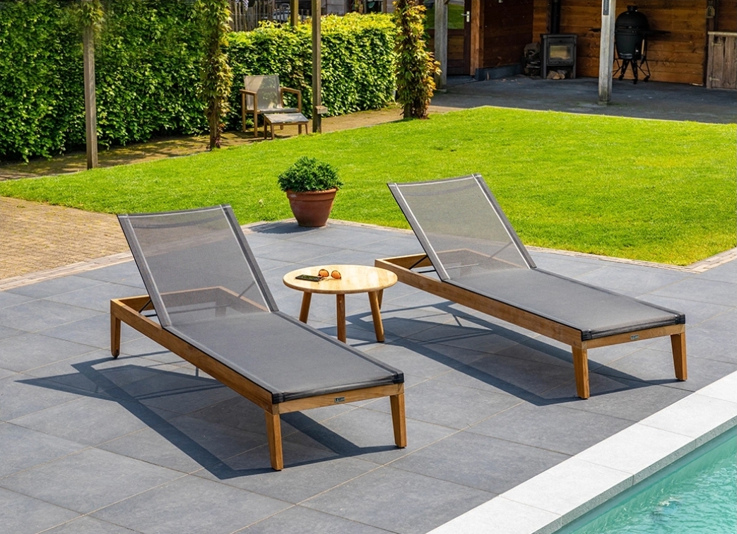 Liegen mit Gestell aus Teakholz, natur unbehandelt, fahrbar, Rücken verstellbar. Größe 211×65 cm, Höhe 34,5 cm.