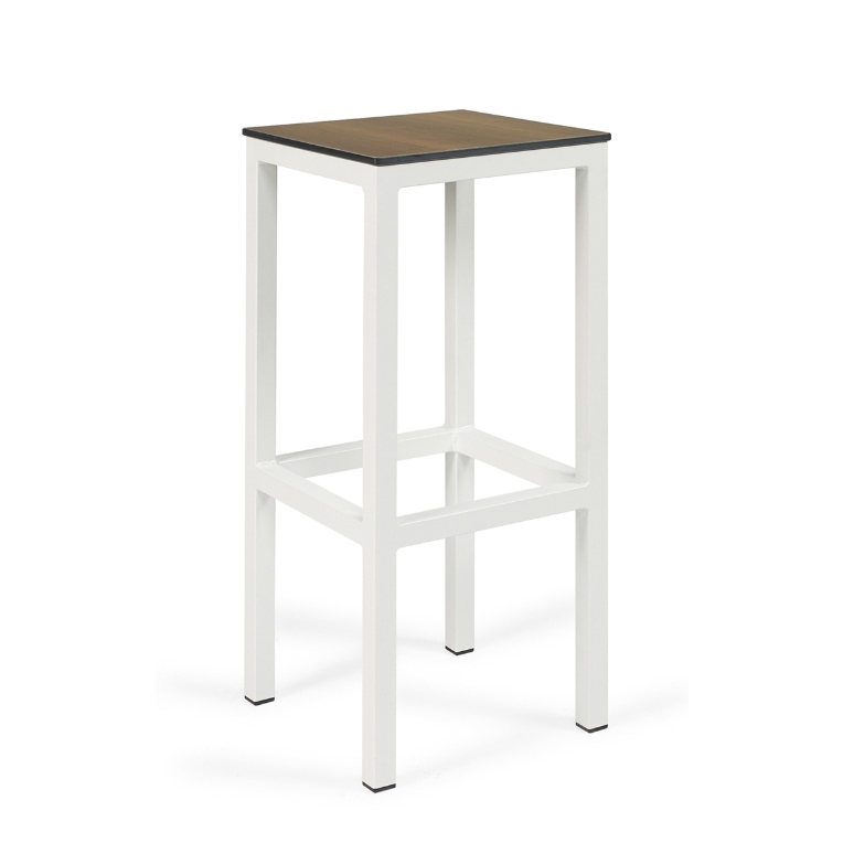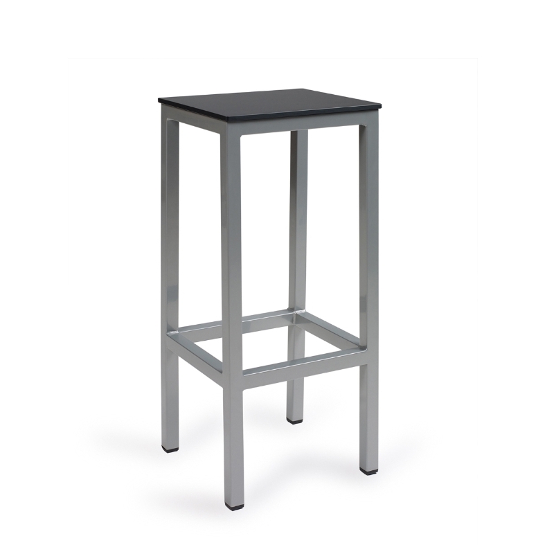 Barhocker für Gastgarten oder Terrasse mit Gestell aus Aluminium wahlweise in den Farben silber, weiß oder schwarz. Der Sitz besteht aus einer robusten HPL-Platte und ist damit sehr pflegeleicht.