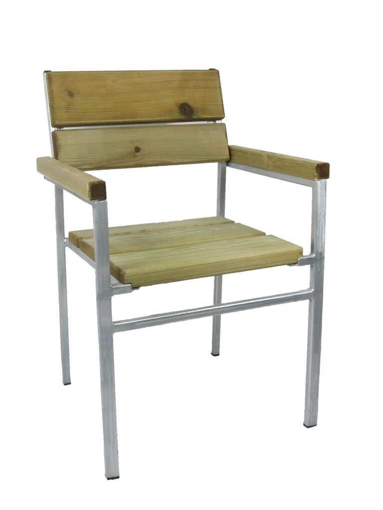 Stapelbare Gastgartenstühle, Gestell Stahlrohr feuerverzinkt, dicke Massivholzbelattung in Lärche natur oder Kiefer kesseldruckimprägniert.