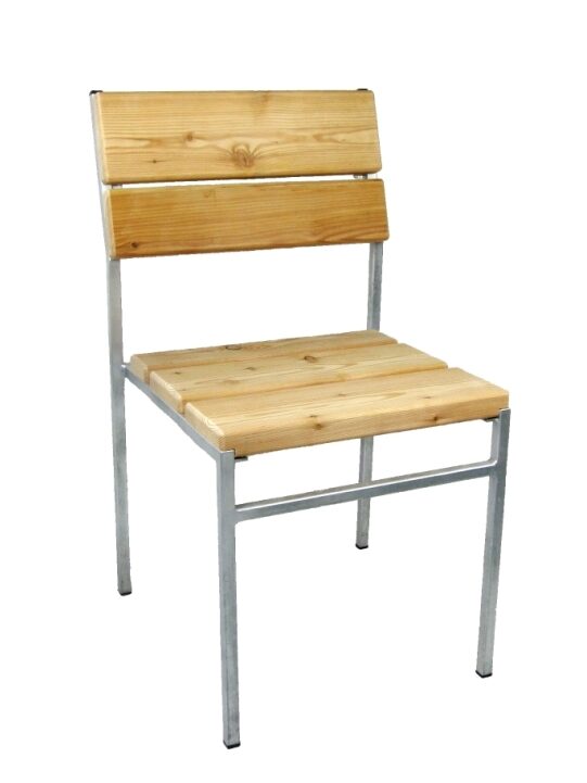 Stapelbare Gastgartenstühle, Gestell Stahlrohr feuerverzinkt, dicke Massivholzbelattung in Lärche natur oder Kiefer kesseldruckimprägniert.