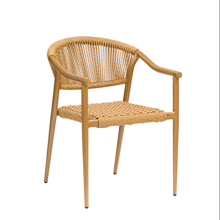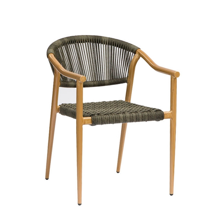 Die Terrassenstühle sind stapelbar, Gestell aus Aluminium in Holzoptik, Schnurgeflecht in grau oder creme möglich.