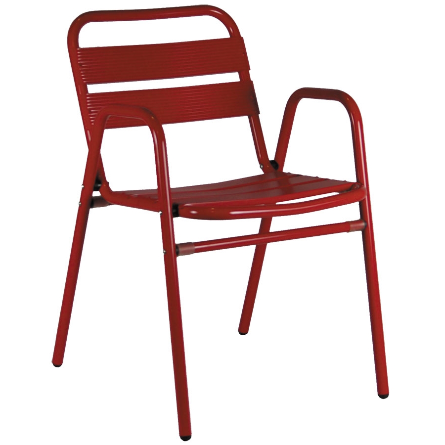 Die Terrassenstühle sind stapelbar, Gestell und Belattung aus Aluminium.