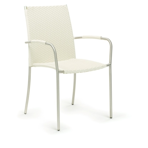 Stapelbare Terrassenstühle mit Gestell aus gebürstetem Edelstahl, Sitz- und Rückenfläche mit Flachgeflecht in weiß, auch die Armlehne sind mit dem Geflecht überzogen.