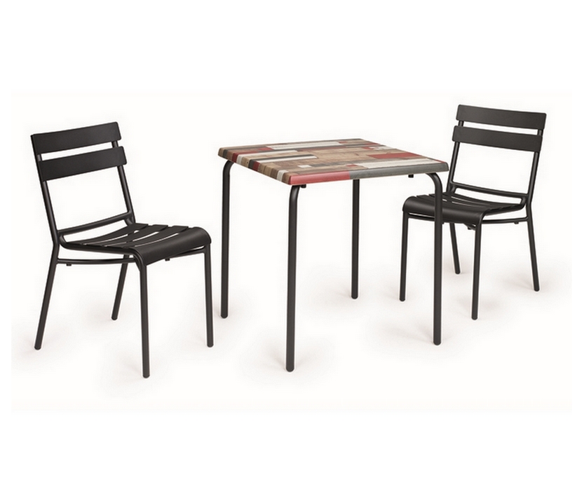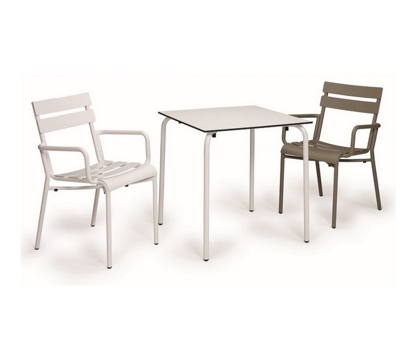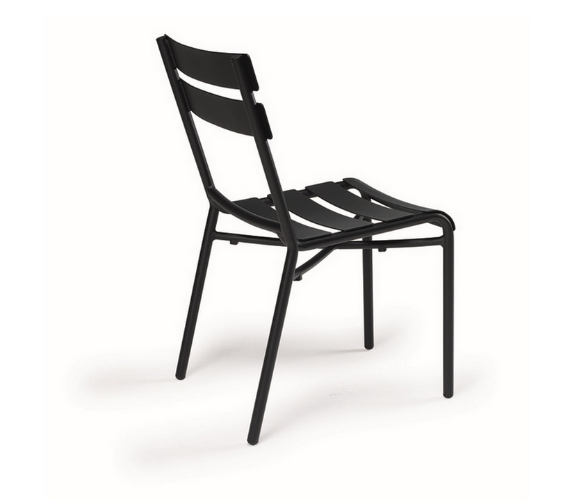 Die Terrassenstühle sind stapelbar, Gestell und Belattung aus Aluminium.